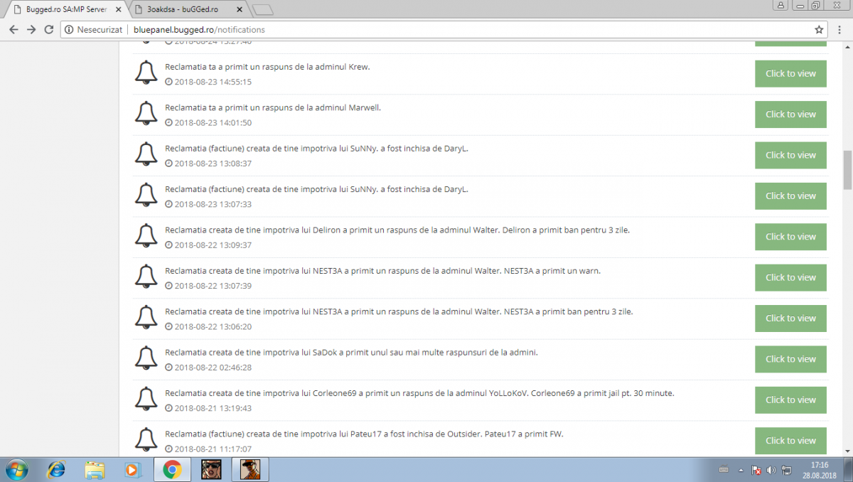 Uita-te si tu ce admini, cum se scot intre ei, primesc raspuns in reclamatie de la Sadok cum ca era din cauza rezolutiei si a scris ea corecthttp://bluepanel.bugged.ro/complaint/view/1043068 http://bluepanel.bugged.ro/complaint/view/1043085 , dar de fapt nu a scris corect si nu stia cum sa o scape de sanctiune si il scapa Managerul Shahmen de sanctiune , apoi il reclam pe Shahmen(managerul) si ii cer dovada pentru rezolutie si de ce nu sanctioneaza si ce se gandeste SunShine hai sa ii dam suspend ca va scapati voi intre voi nu ? http://bluepanel.bugged.ro/complaint/view/1043484 3oakdsa was suspended from panel by SUNSHiNE for 3days, reason: multiple reclamatii aiurea [complaint:1043484] si sadok face si manevre pe la reporteri de ii scuteste de sanctiunii.
